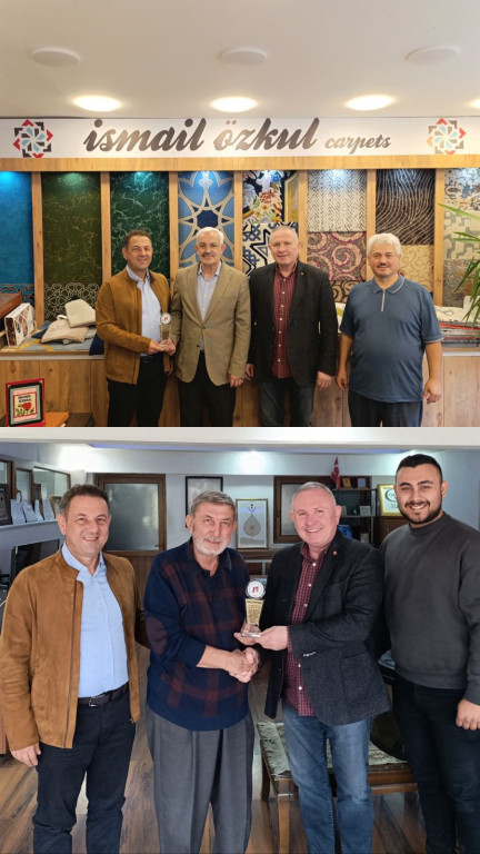 Yönetim Kurulu Başkanımız Kasım Kabak ve Meclis Başkanımız İbrahim Akarsu ile birlikte, İsmail Özkul Halıcılık A.Ş. ve Gayret Yün İplik ve Halı San. ve Tic. Ltd. Şti. firmalarımızı ziyaret ederek, ihracat başarılarını kutladık. Ziyaretimizde, bu firmalarımıza, uluslararası ticaretteki üstün başarılarını simgeleyen ihracat rekortmeni plaketlerini takdim ettik.